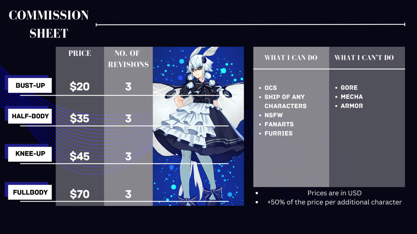 I RETAIN ALL RIGHTS FOR THE COMMISSIONED ARTWORKS (INCLUDING POSTING THEM ON SOCIAL MEDIA (WITH WATERMARKS) AND USING THEM AS SAMPLES)